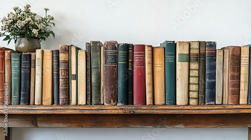 book, book, shelf, wooden, vintage, hardback, collection, row, library, literature, antique, brown, spine, title, author, paper, page, text, cognition, history, fiction, education, reading, classic, aged, worn, dusty, organised, neat, display, home, decor, white, wall, flower, pot, plant