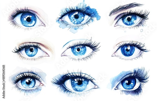 watercolor, eye, blue, expressive, texture, emotion, depth, artistic, beauty, serene, graceful, aethereal, modern, vibrant, dynamic, elegant, hand-made, emotional, soulful, captivating, dreamy, variety, collection, eye, woman, set, eyebrow, eyelash, eyeball, eyelash, iris, fashion, people, design