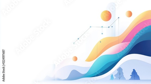 A colorful, abstract landscape with flowing waves, vibrant colors, and geometric shapes against a light background.
