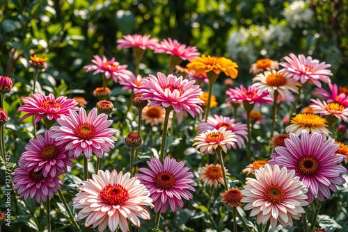 flower, nature, pink, orange, bloom, garden, plant, greenery, sunlight, bright, flower petals, flora, horticulture, scene, botanical, outdoors, colourful, blossom, leaf, high-coloured, spring, floral, display, beautiful, ornamental, photo, close, up, landscape, vibrant, bed, lively, happy, cheerful, sunlit