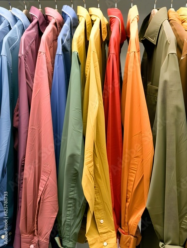 A colorful array of shirts hanging on a store rack. Suitable for fashion retail, clothing store promotions, seasonal sales, and vibrant apparel advertisements