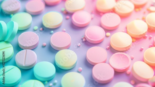 A colorful assortment of pills are scattered on a pink background