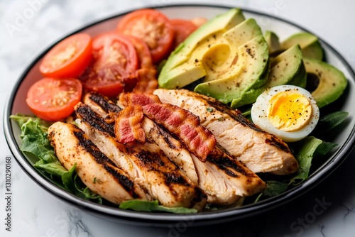 A colorful bowl features grilled chicken strips, sliced avocado, fresh tomatoes, crispy bacon, and a soft-boiled egg, arranged on a bed of greens, showcasing a healthy meal
