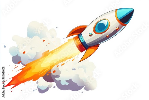A colorful cartoon rocket blasting off leaving behind a trail of billowing clouds and flames