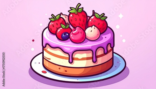 cake, dessert, sweet, pink, berry, strawberry, fruit, cream, blueberry, illustration, cartoon, food, delicious, tasty, festive