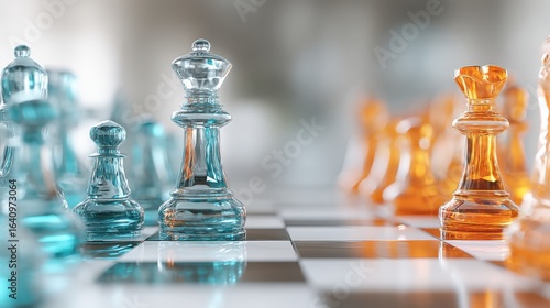A colorful chess set features transparent blue and orange pieces, arranged on a classic black and white checkered board.