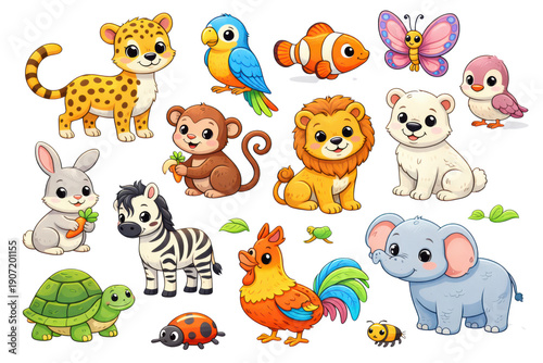 animal, animal, cartoon, cute, lion, zebra, monkey, elephant, cheetah, parrot, clownfish, butterfly, rabbit, penguin, rooster, turtle, snail, coccinellidae, bee, childlike, illustration, vector, graphic, mammal, bird, fish, insect, wildlife, nature, forest, jungle, savanna, adorable, playful, friendly, whimsical, colourful, bright, happy, joyful, design, character, creature, artwork, digital, isolated, flat