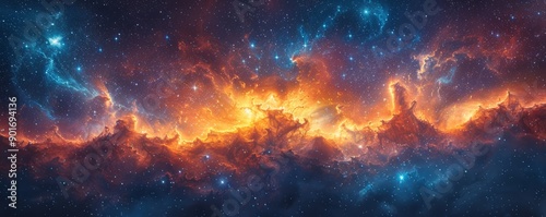 A colorful galaxy with orange clouds and blue stars