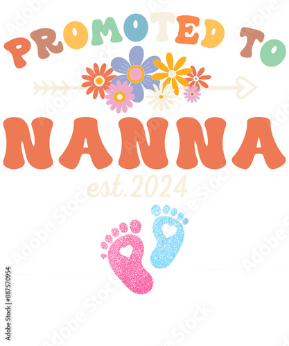 A colorful graphic announcing a pregnancy with the text "Promoted to Mama est 2024" featuring flowers, an arrow, and baby footprints.