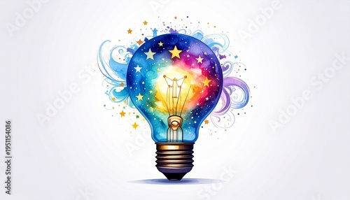 A colorful lightbulb filled with swirling cosmic hues and radiant energy, symbolizing imagination, inspiration, and the brilliance of a bright idea bursting into life.
