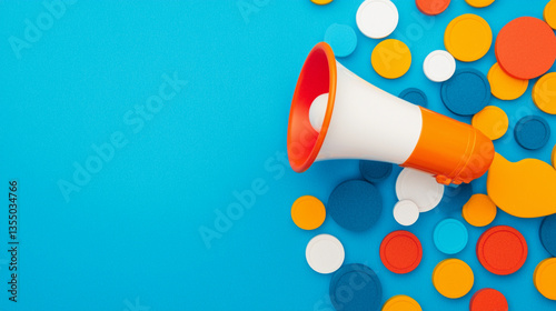 A colorful megaphone surrounded by various circular shapes on a bright blue background, symbolizing communication and announcement.