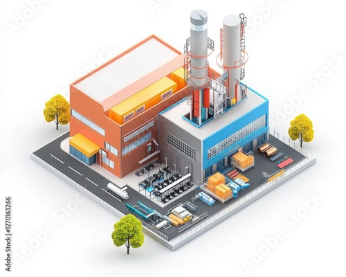 A colorful, modern industrial facility featuring multiple buildings, smokestacks, and vehicles, set in a landscaped environment.