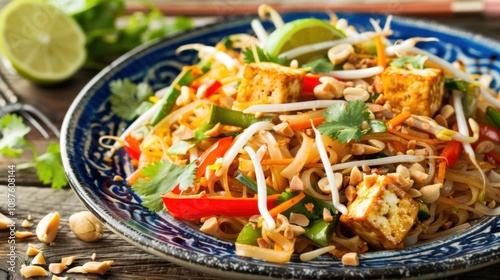 A colorful plate of vegetable pad Thai with stir-fried noodles, tofu