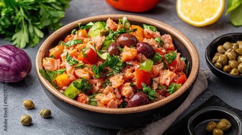 salad, vegetable, olive, herb, fresh, wellness, presentation, enjoyment, vibrant, mediterranean, harvest, festive, feast, balanced, ingredient, crunch, nourishment, favor, seasoning, receipe, wholesome, vegan, snack, pepper, lemon, freshness, culinary, parsley, dietary, tomatoes, kale, healthy, epicure, appetising, meal, colourful, green, caper, natural, food, organic, bowl, cooking