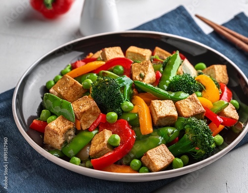 A colorful vegetable stir-fry with bell peppers, broccoli, snap peas, and tofu in a savory