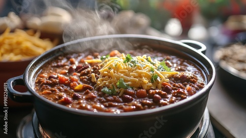 A comforting scene of a warm bowl of chili being served at a cozy gathering, with steam rising and toppings like cheese and sour cream ready for guests.