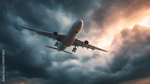 A commercial airplane climbs through the clouds, symbolizing progress and human ambition in aviation.