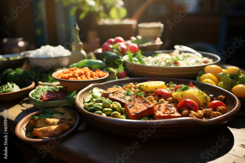 A communal potluck gathering, featuring dishes from different cultures, symbolizing unity through food. Generative Ai.
