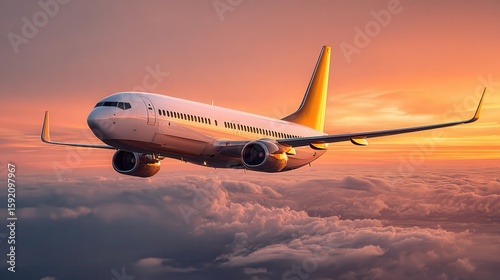 a completely white boeing 737 with a yellow rear stabilizer flying high above the clouds at sunset, beautiful orange sunser colors, close up view from the side.