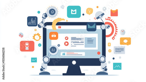 A computer with robot arms moving around icons representing digital marketing tasks: newsletters, social media, client management, ads, search optimization, and growth.