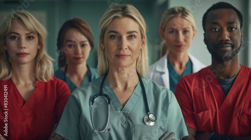 A confident and diverse healthcare team, including doctors and nurses, stands together in a hospital, showcasing their dedication and teamwork.