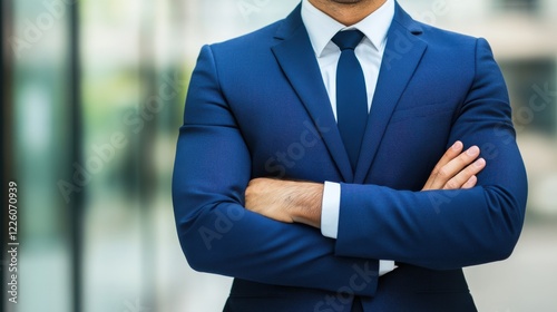 A confident businessman in a blue suit stands with arms crossed, exuding professionalism and authority in an urban setting.