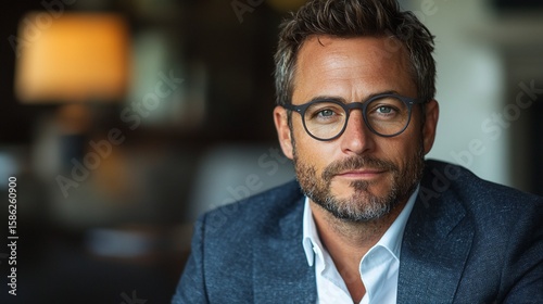 A confident man with stubble and glasses, wearing a blazer and shirt, looks directly at the camera
