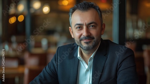 A confident middle-aged businessman with a beard sits at a table in a stylish restaurant, wearing a dark suit and smiling warmly.
