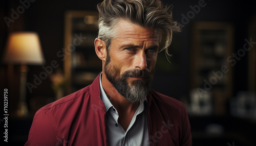 A confident, serious businessman with a beard, looking at camera generated by AI