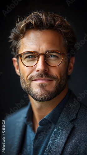 A confident, well-dressed man with glasses and a slight beard is looking directly at the camera, set against a dark background, Ideal for professional headshots, business, or personal branding,