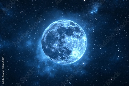 A constellation of twinkling stars shines brightly in the mystical night sky, under the gentle glow of a luminous blue moon