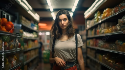 food market, shopping, aisle, shelf, product, retail, consumer, purchase, fresh produce, lighting, commerce, selection, variety, shopping cart, convenience, nourishment, choice, option, brand, package, label, price, offer, deal, discount, supermarket, market, buyer, stocked, casual clothes, browsing, cardboard box