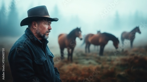 A contemplative cowboy stands by as horses graze in the misty field, encapsulating themes of freedom, nature, and the bond between humans and animals in an untouched landscape.