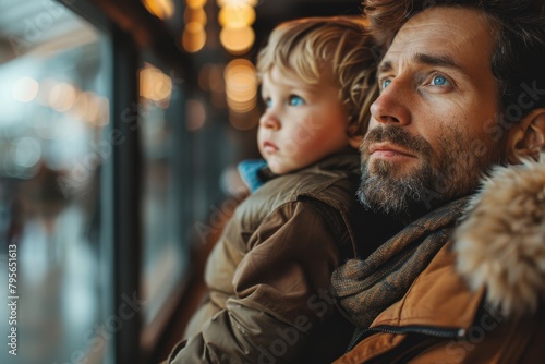 father, son, bond, wonder, window, looking, gaze, family, contemplation, kinship, togetherness, eltern, children, human relationships, warmth, closeness, emotion, protection, care, thoughtfulness, love, generation, tenderness, male, introspection, future, hope, innocence, childhood, fatherhood, parenting, sharing, moment, trust, security, urban, winter, apparel, fashion