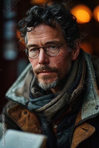 A contemplative man with curly hair and glasses sits thoughtfully in a cozy cafe, surrounded by warm lighting while enjoying a moment of reflection on a chilly afternoon
