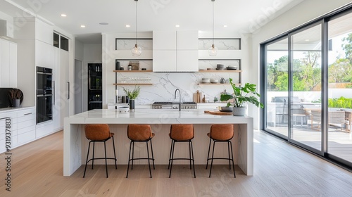 A contemporary kitchen with an open layout, featuring a large island with bar stools, white cabinetry, and a clean, minimalist design.