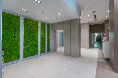 A contemporary office lobby showcases a green moss wall, polished floors, and modern lighting. The space is bright, clean, and inviting, perfect for a professional setting.