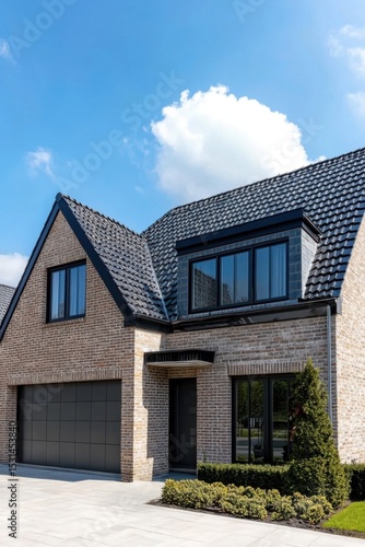 modern, house, residential, architecture, suburban, neighbourhood, landscaped, yard, large, window, brick, exterior, contemporary, design, bright, sky, space, elegant, structure, home, family, residence, green, plant, sunny, day, front, entrance, driveway, attractive, stylish, detail, puffy, cloud, architectural, feature, peaceful, surrounding, inviting, atmosphere, compact, lawn, double, garage, new, construction, urban, living