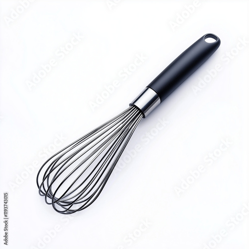 A contemporary whisk with an ergonomic silicone grip handle and sleek metal wires, offering practicality and comfort for culinary use