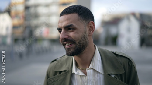 A content Arab man strolls down city. Tracking shot of a thoughtful Middle Eastern male wearing a jacket portrait face closeup in motion