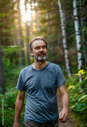 A content man enjoys a peaceful walk in nature, his serene expression reflecting the tranquility of a healthy mind and body.
