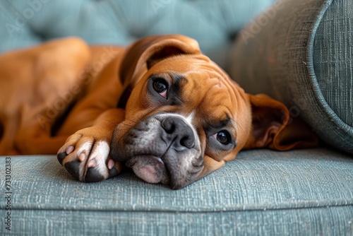 dog, pet, animal, bulldog, mammal, snout, boxer, sofa, indoor, fawn, brown, relaxed, lazy, cosy, comfortable, content, sleepy, lounging, domestic, companion, paw, wrinkled, intelligent, adorable, loyal, family, fur, wrinkly, peaceful, serene, resting, calmness, home, relaxation, leisure, love, friendship, harmony, oneness, stylish, contemporary, luxury, simplicity, minimal, elegant