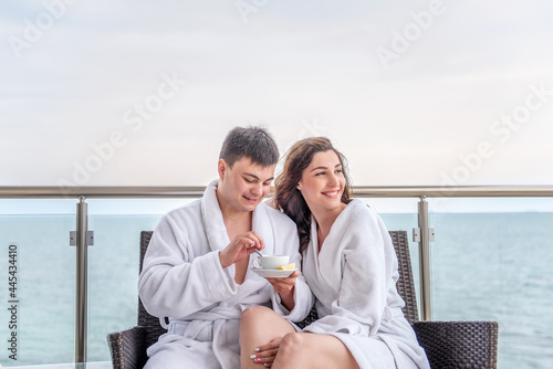 travel, sea, honeymoon, february 14, bathrobe, man, woman, tea, lifestyle, couple, together, passion, furniture, rattan, girl, blue, mug, date, medicals, care, sitting, health, white, background, luxury, hotel, beauty, cosmetic, hugs, smile, enjoy, balcony, harmony, love, holiday, massage, relaxation, morning, wellness, happy, caucasian, drinking, honeymooners, trip, terrace, ocean, lemon, cup, lover