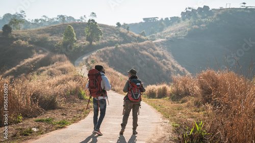 A couple is hiking along a forest trail on a beautiful day, enjoying nature and their outdoor adventure perfect for themes of travel, hiking, and togetherness.