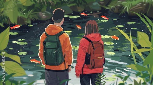 couple, standing, river, using, app, identify, type, fish, swimming, water, learning, graphic, datum, hologram, virtual, cyber, science, futuristic, digital, abstract, background, technology, effect, future, tech, interface, neon, element, laser
