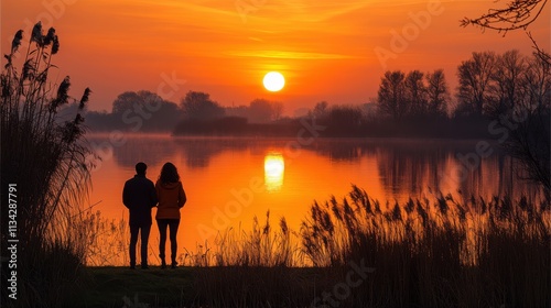 sunset, lake, couple, nature, calmness, silhouette, water, tree, reed, evening, romance, landscape, sky, orange, peaceful, scenery, love, harmony, beauty, calm, dusk, environment, serenity, togetherness, horizon, warmth, relaxation, exploration, adventure, connection, intimacy, escape, joy, bliss, moment, appreciation, atmosphere, stillness, freedom, oneness, wonder, light