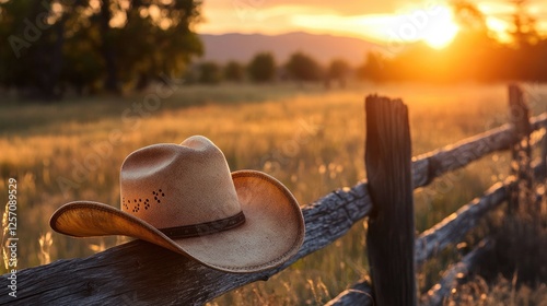 A cowboy hat resting on a wooden fence under the golden sunset light.
