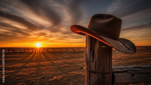 hat, sunset, field, fence, wood, horizon, sky, orange, gold, ray, light, sun, dramatic, cloud, western, rural, rustic, country, scene, dawn, dusk, hours, day, nature, outdoors, ranch, farm, land, huge, expansive, summer, warm, vibrant, glow, post, brown, leather, rim, shade, shadow, tranquil, peace, hope, journey, wild, free, adventure, image, detail