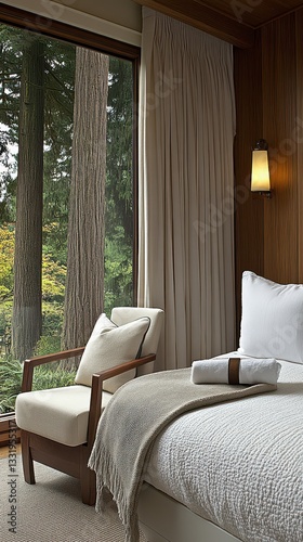 bedchamber, cosy, bed, comforter, pillow, window, chair, relaxation, natural, light, stylish, decor, interior, design, furniture, soft, fluffy, neat, inviting, atmosphere, calmness, home, aesthetic, warmth, space, modern, serene, peaceful, bright, elegant, chic, ambience, retreat, comfort, cushion, textile, drape, view, sunlight, shade, room, arrangement, accessory, colours, harmony, simplicity, layout, restful