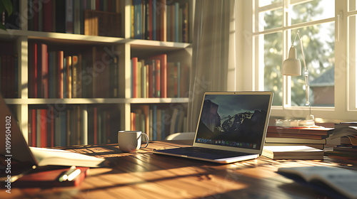 A Cozy Home Office Space with a Laptop, Coffee Mug, and Warm Natural Light Illuminating the Inviting Desk Surrounded by Bookshelves and Tranquil Ambiance